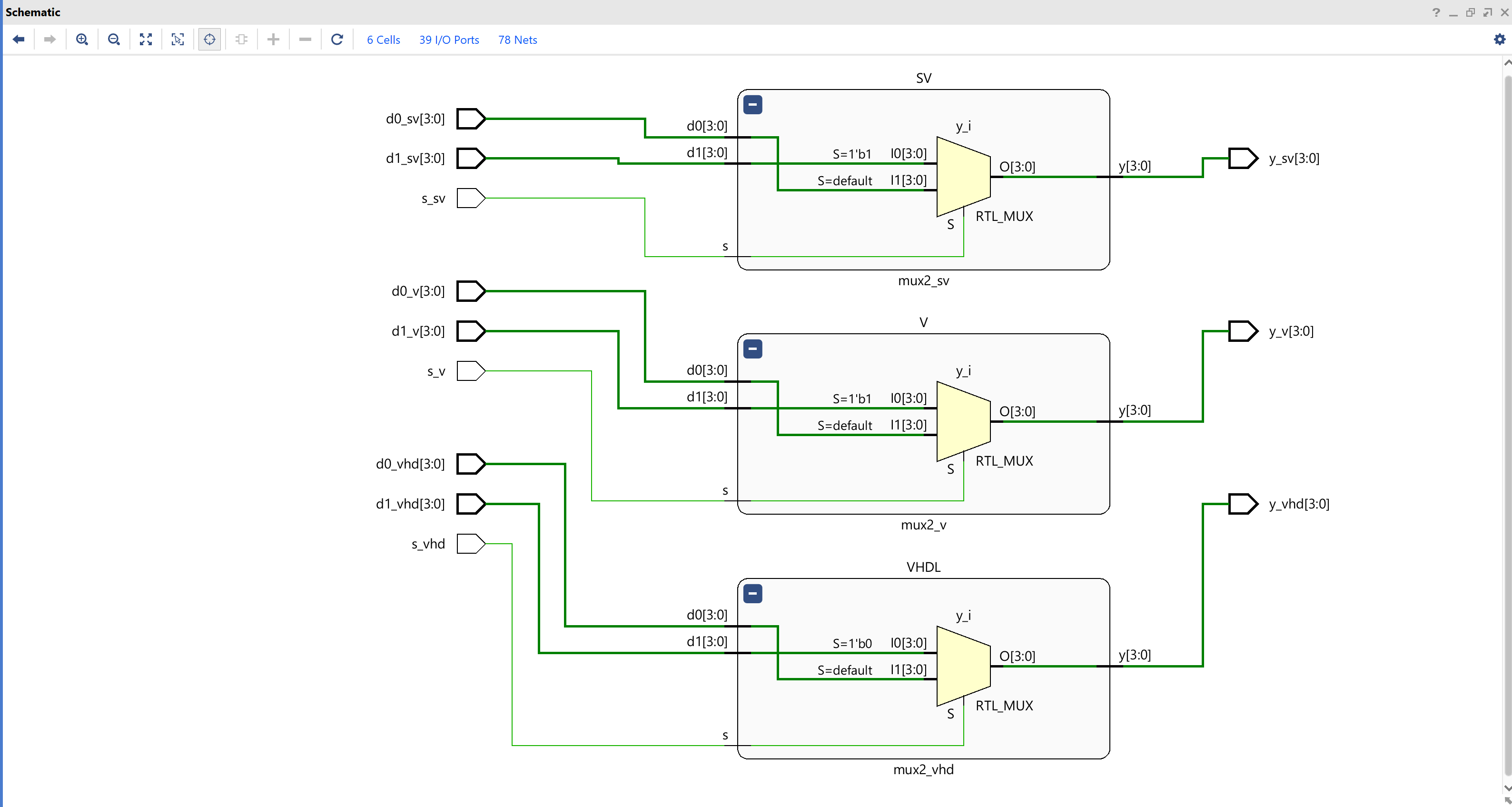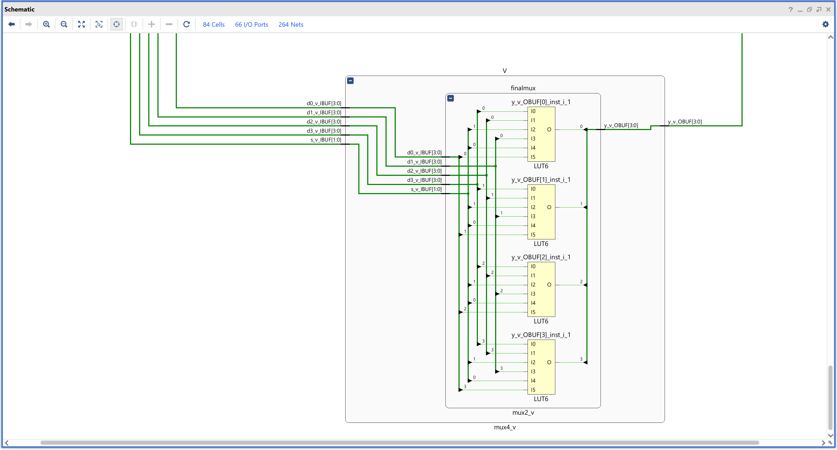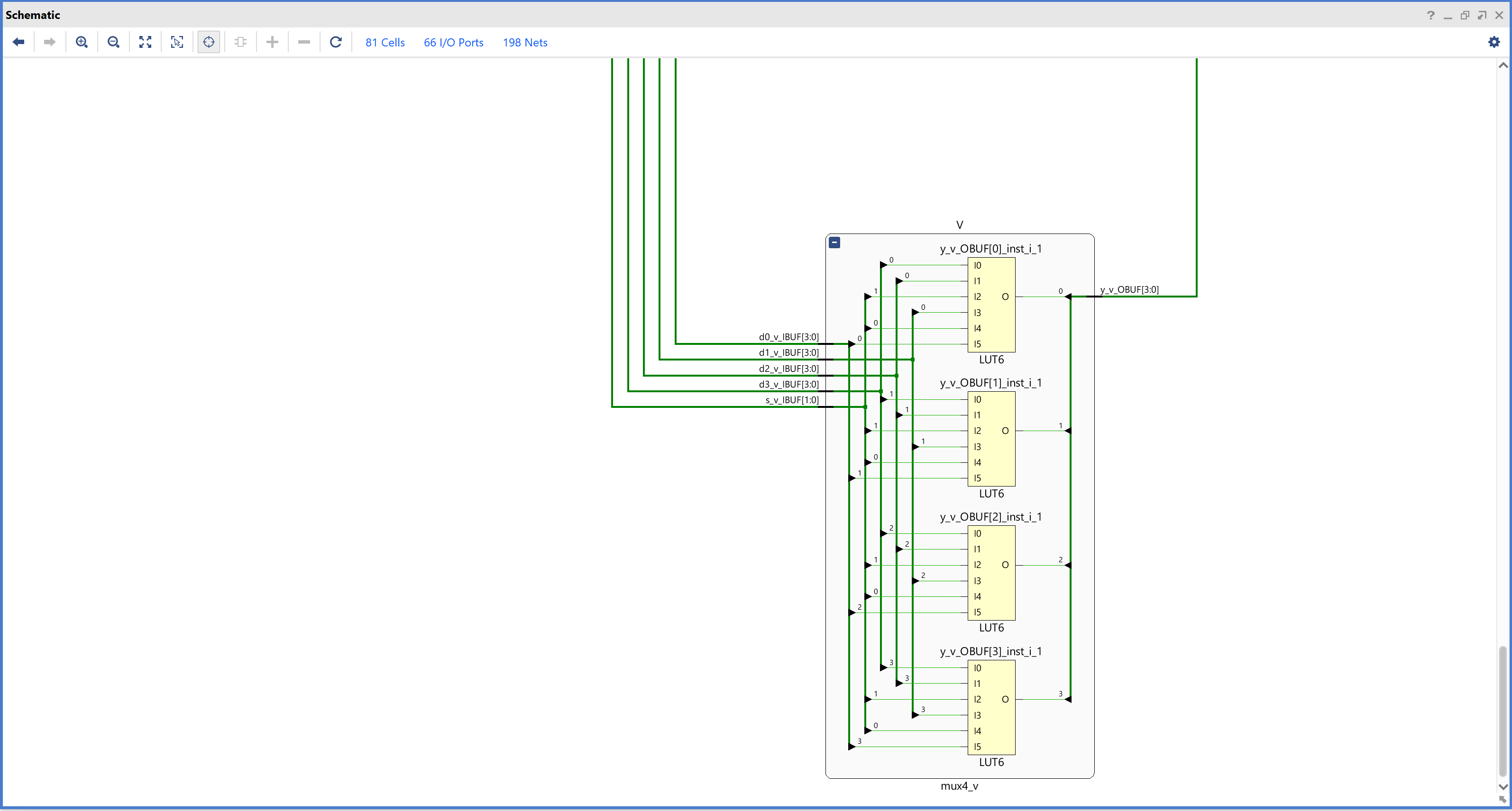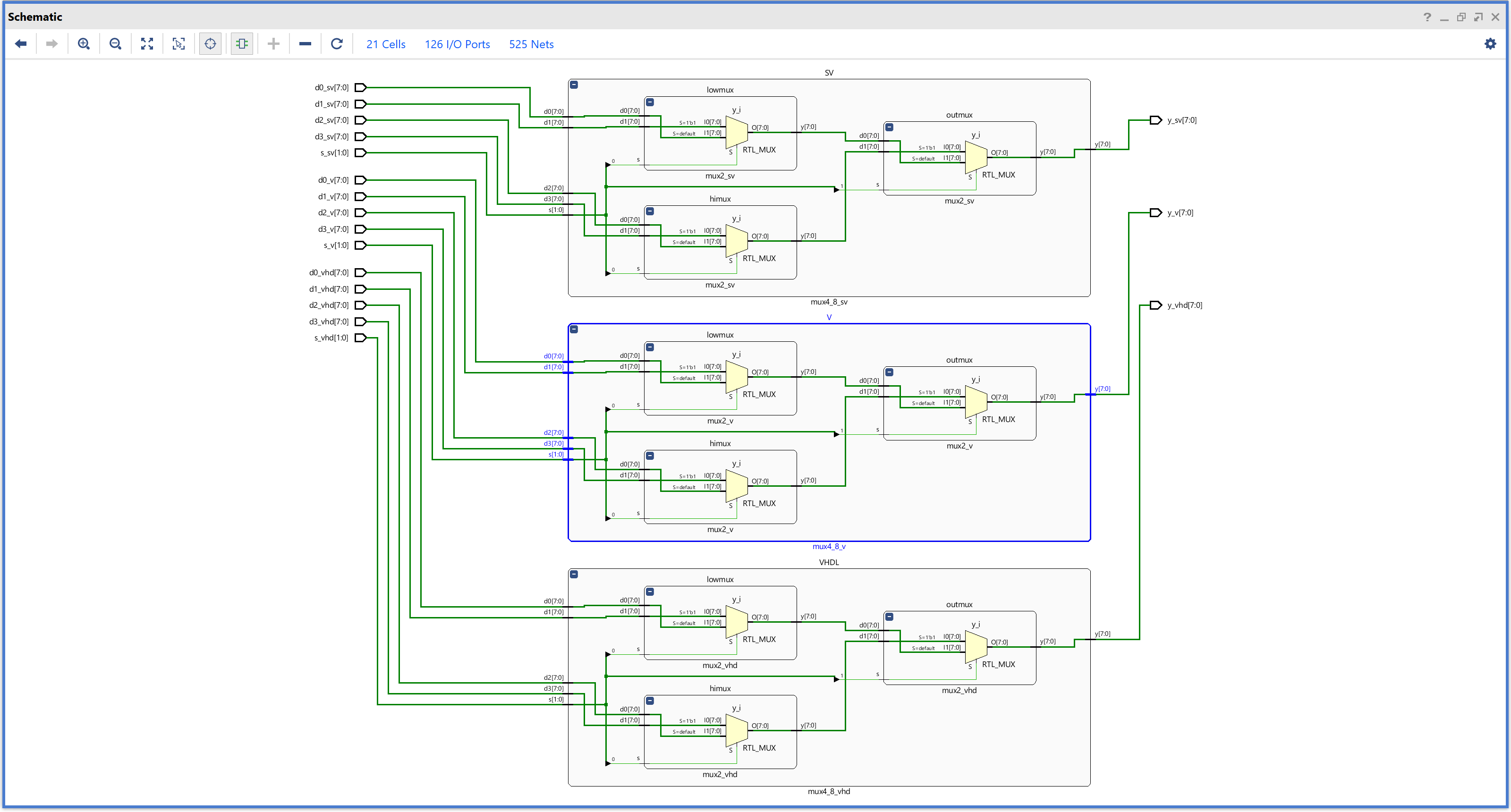 mux2_v lowmux (d0, d1, s[0], low); mux2_v highmux (d2, d3, s[0], high); mux2_v finalmux (low, high, s[1], y);