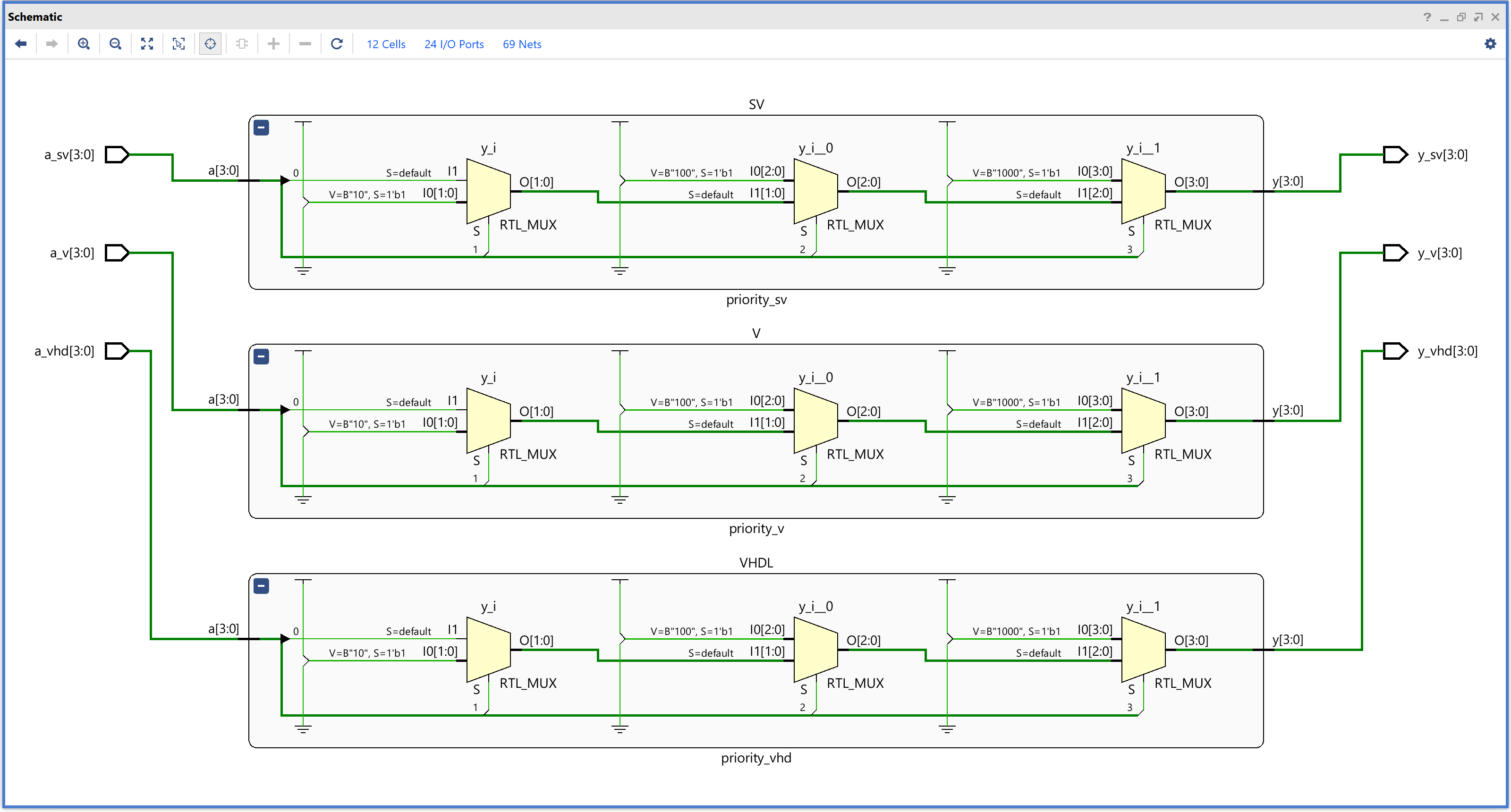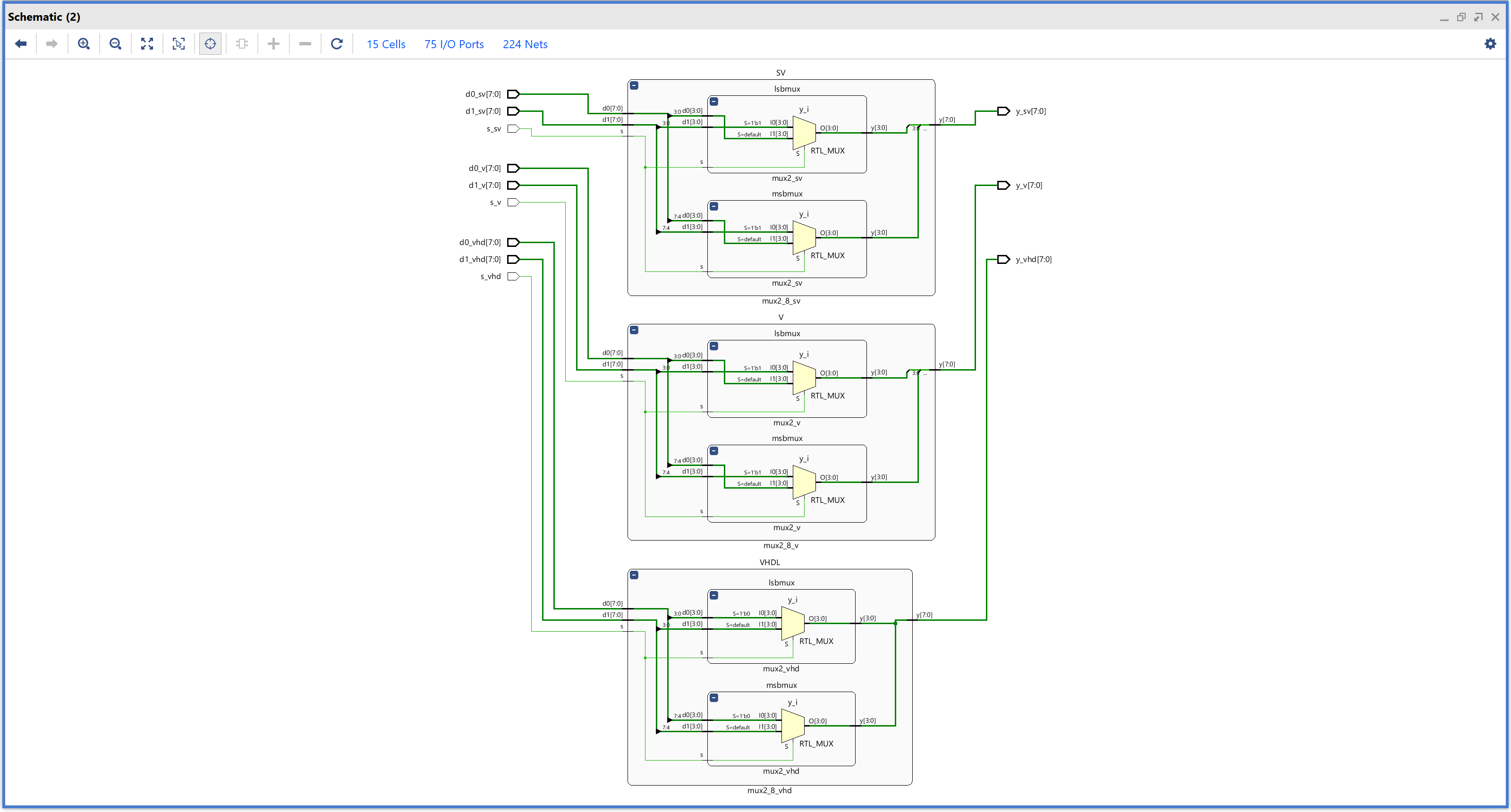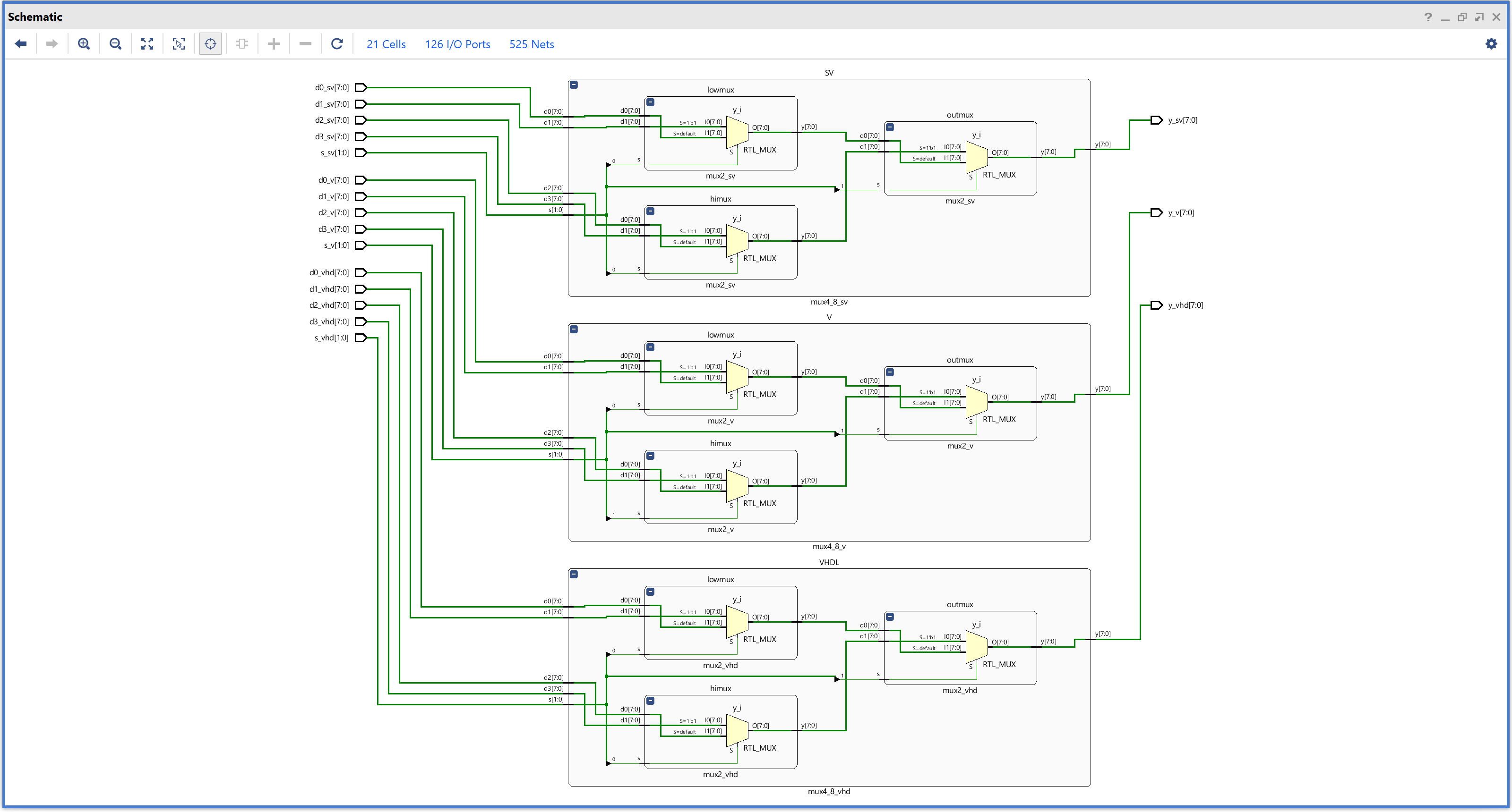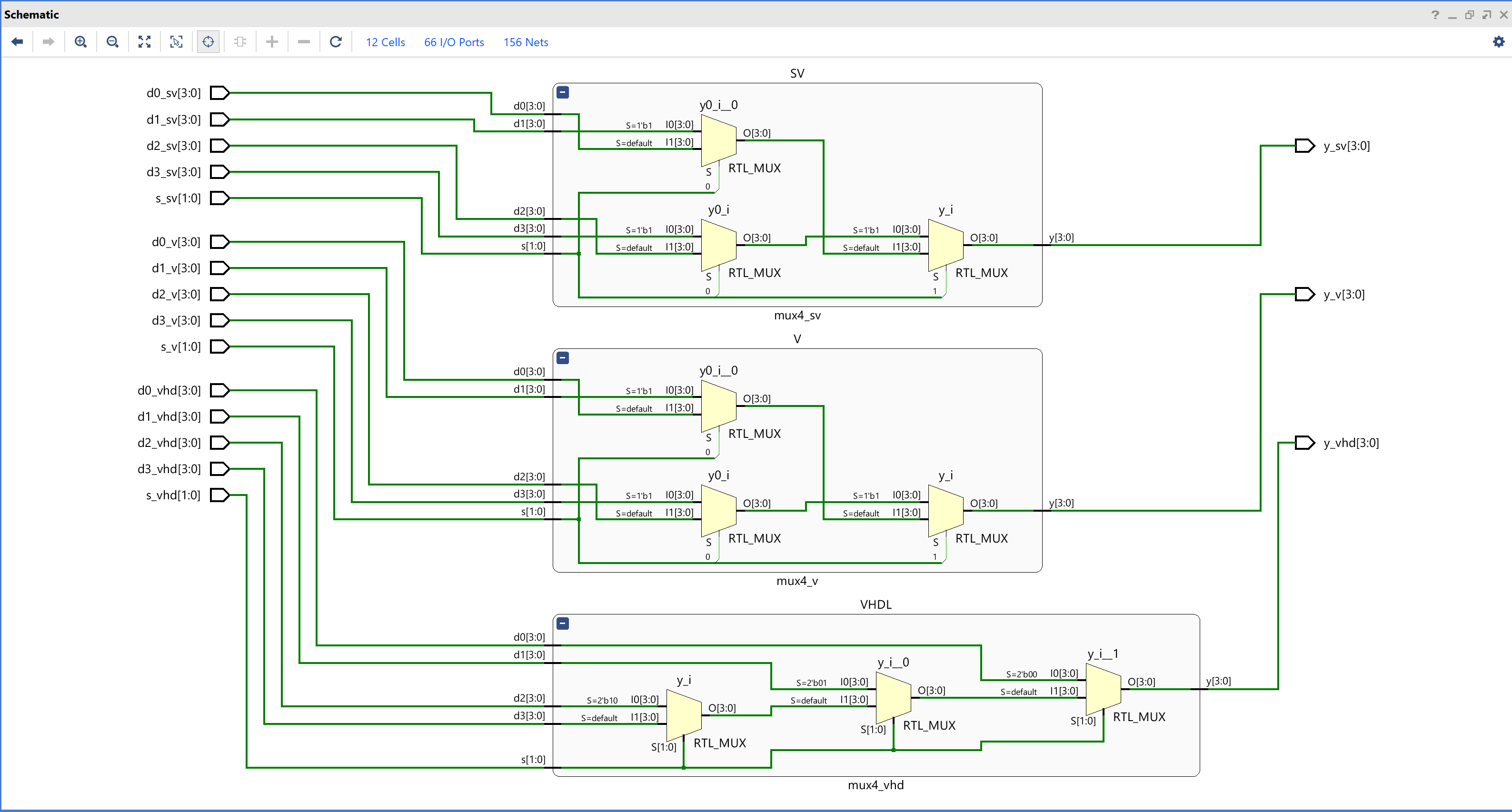 mux2_v lowmux (d0, d1, s[0], low); mux2_v highmux (d2, d3, s[0], high); mux2_v finalmux (low, high, s[1], y);