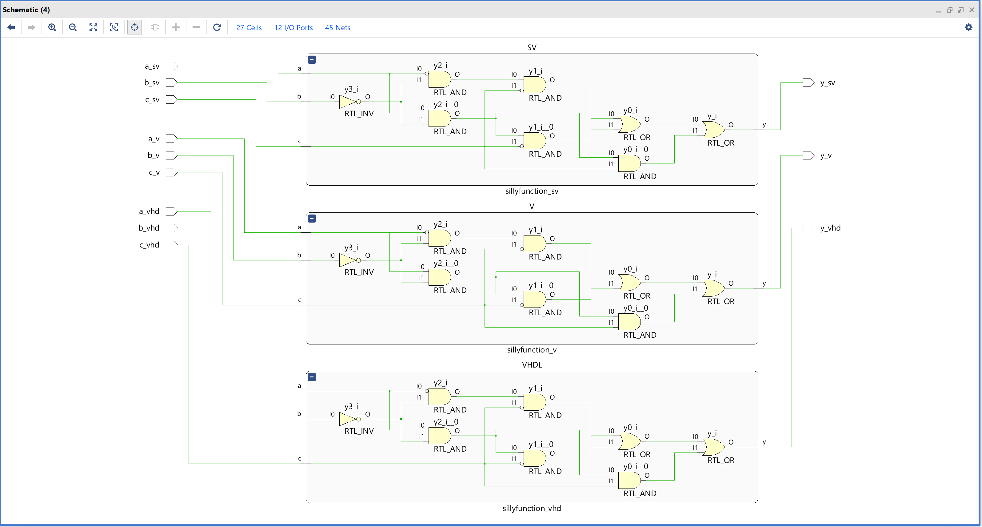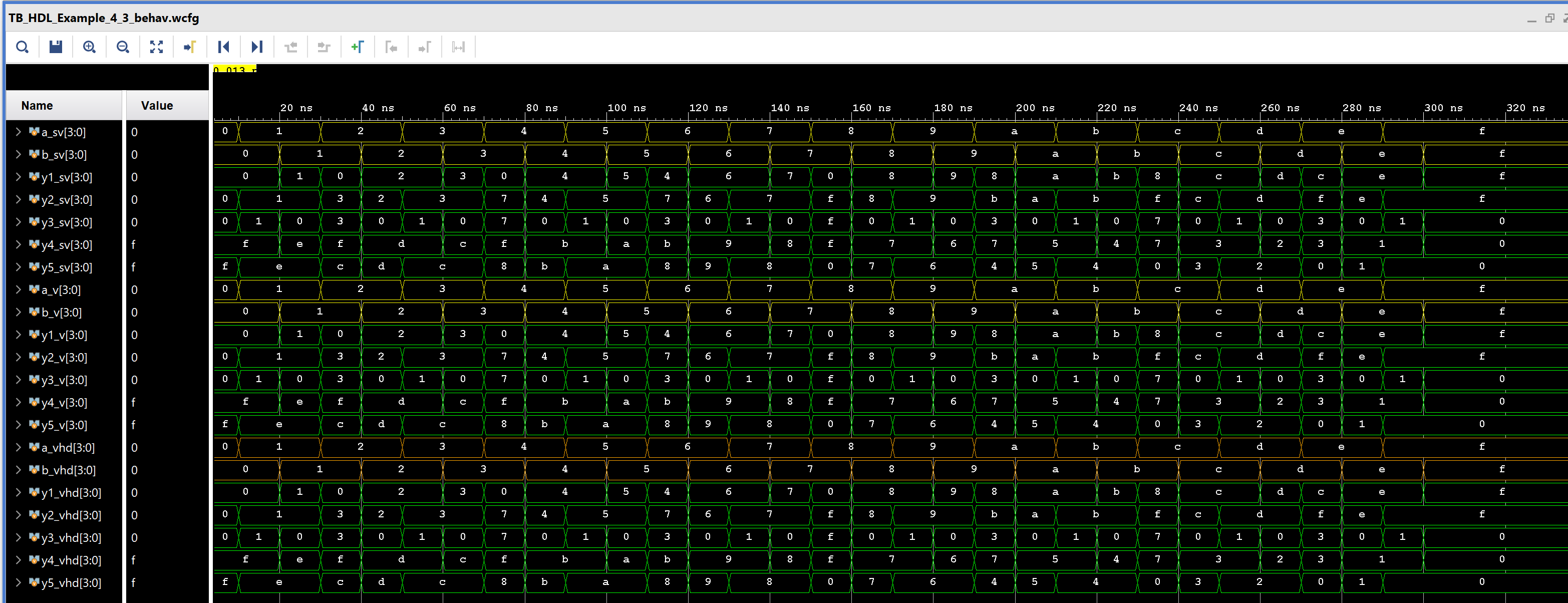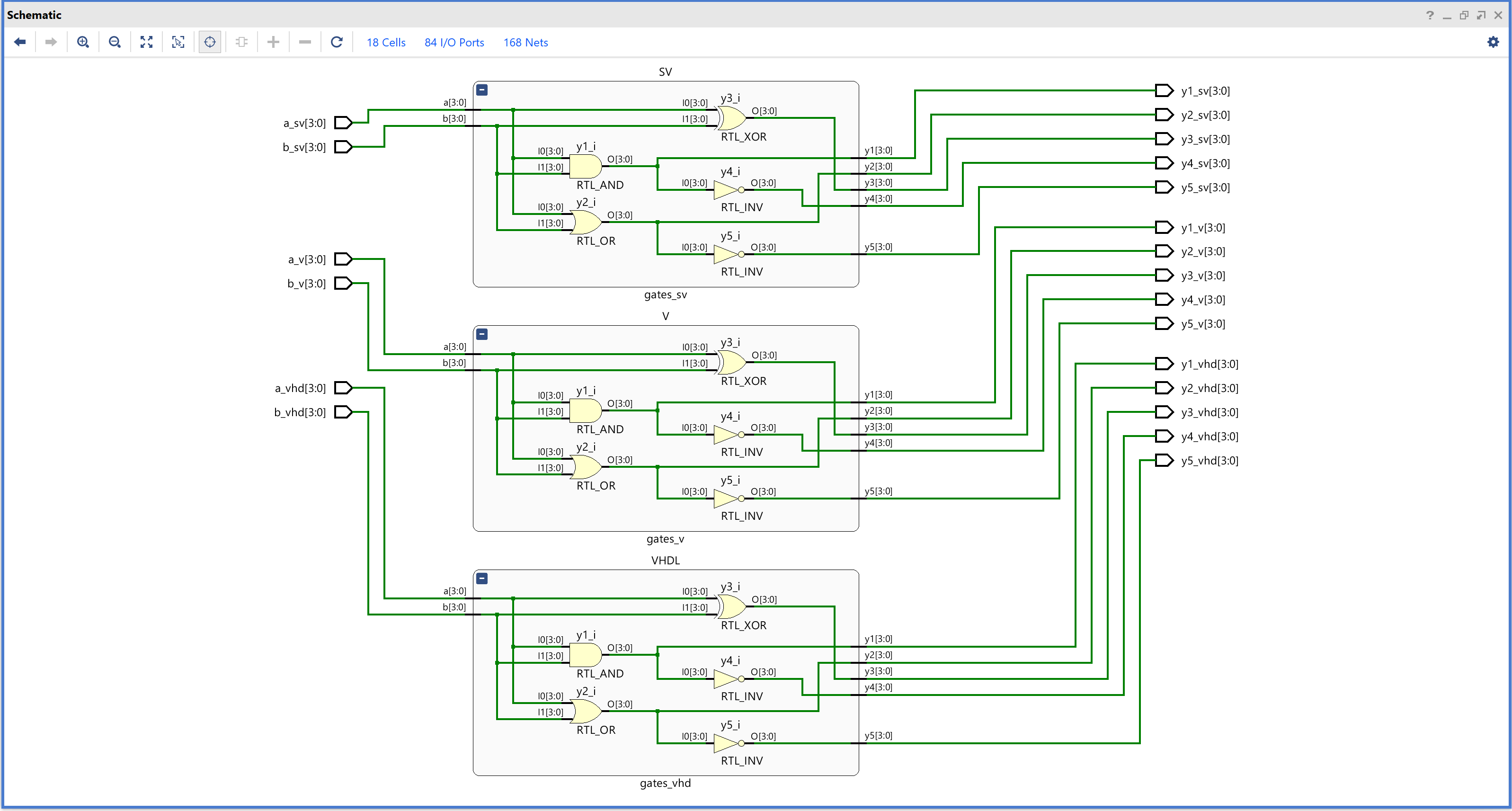 architecture synth of gates_vhd is begin -- five different two-input logic gates -- acting on 4-bit busses y1 <= a and b; y2 <= a or b; y3 <= a xor b; y4 <= a nand b; y5 <= a nor b; end;