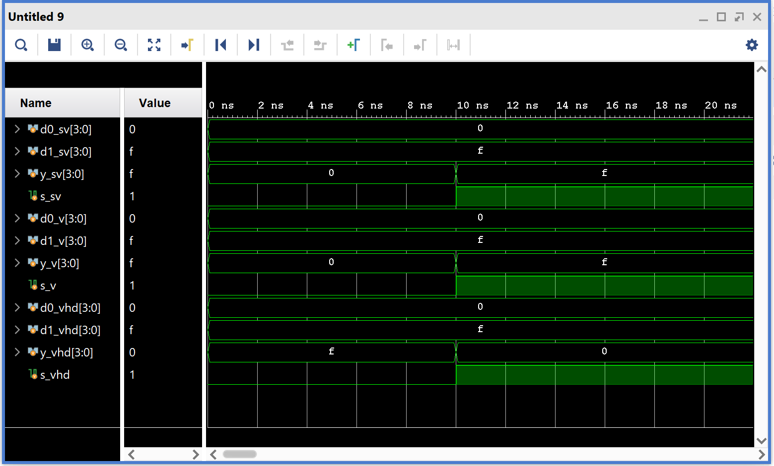 library IEEE; use IEEE.STD_LOGIC_1164.all; entity mux2_vhd is port ( d0, d1: in STD_LOGIC_VECTOR(3 downto 0); s: in STD_LOGIC; y: out STD_LOGIC_VECTOR(3 downto 0) ); end; architecture synth of mux2_vhd is begin y <= d1 when s = '0' else d0; end; |