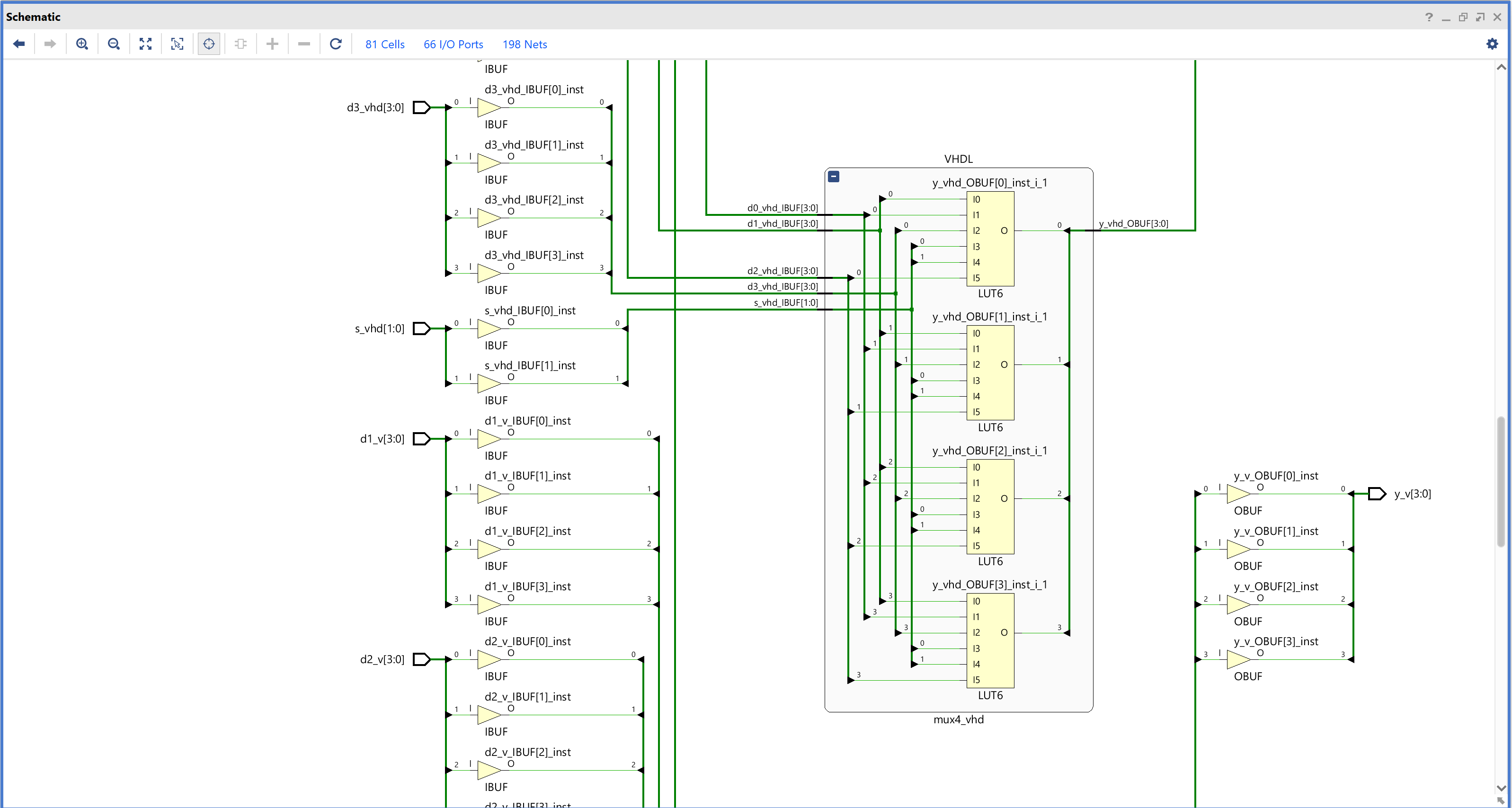 lowmux: mux2_vhd port map ( d0 => d0, d1 => d1, s => s(0), y => low ); highmux: mux2_vhd port map (d2, d3, s(0), high); finalmux: mux2_vhd port map (low, high, s(1), y);